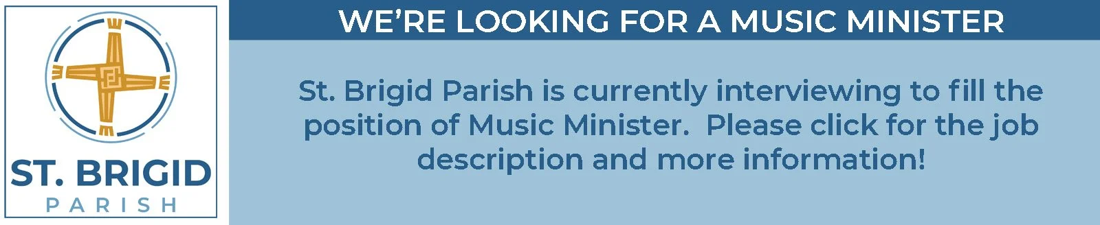 If you feel called to serve in this ministry, we invite you to apply or contact the parish office for more information. Send questions or resumes to office@saint-brigid.org.